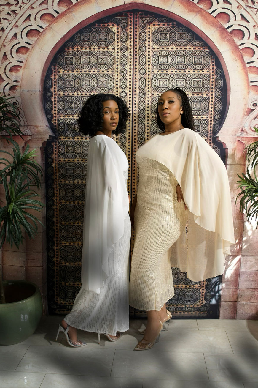 Look effortless in the Banquet Winged Dress Featuring a stunning bat winged chiffon cloak and Stunning sequin detailing that glisten with every movement. Designed for those who embrace modest fashion, this dress combines modesty, elegance and glamour in one package. Perfect for weddings, galas, and other special events, The Banquet Winged Dress ensures you will make a memorable entrance every time.