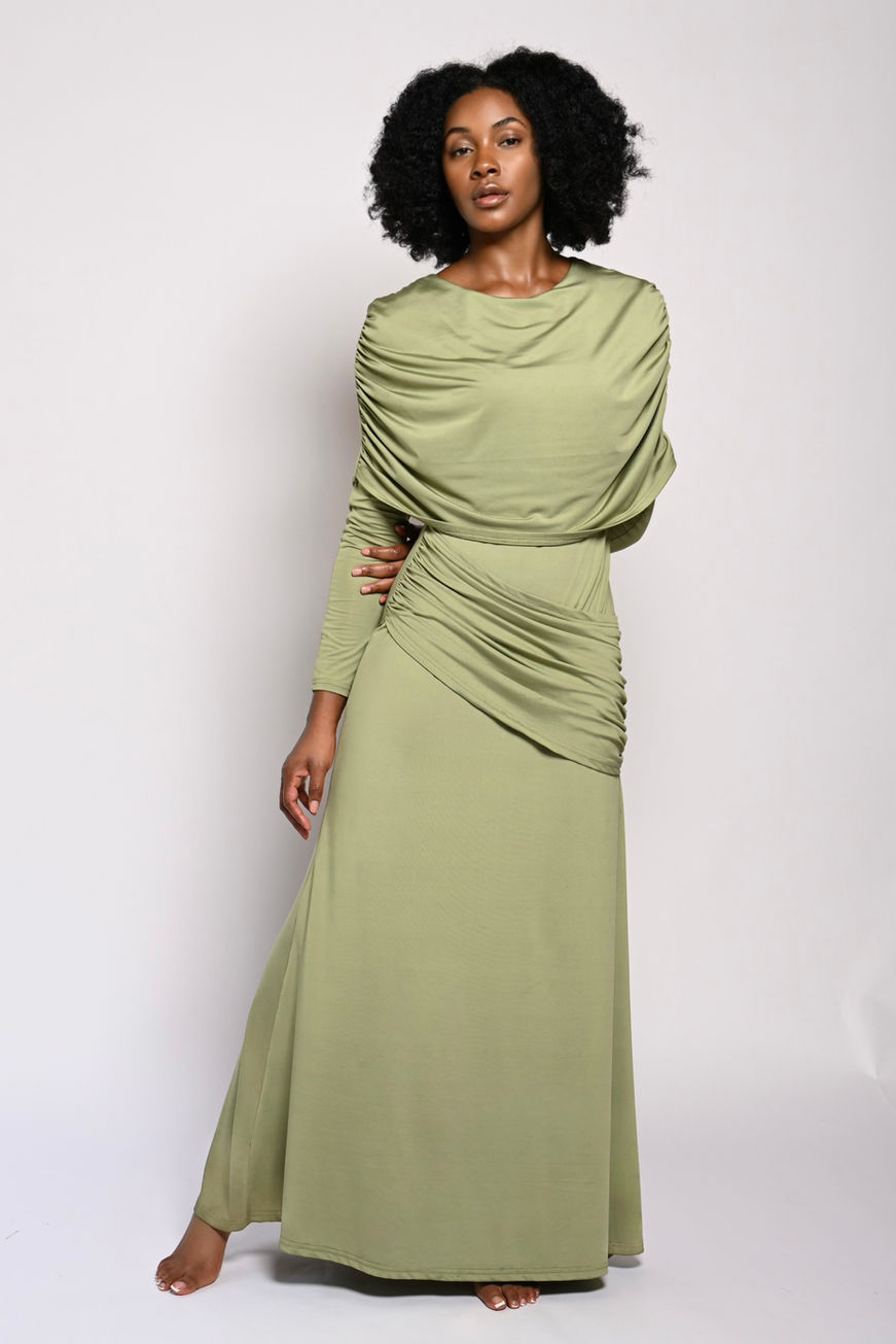 This maxi dress features a versatile shoulder drape that effortlessly hangs from shoulder to shoulder, creating a true statement piece.
