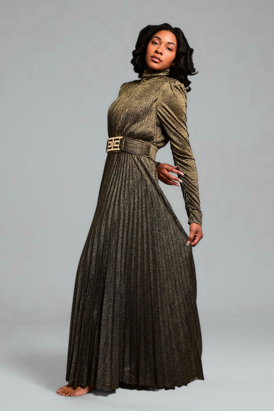 Embrace the perfect modest and luxurious fashion piece with the Ophir Emerald Gown, designed to make a statement at any special occasion. This stunning shiny dress features pleat detail, turtle neck hollow neck design, and a striking gold belt. An elegant garment which flatters every body shape and type, the best part is that it feels and looks even better in person. Whether you're attending a gala or a sophisticated dinner, match it with your favourite pair of heels to complete the look.